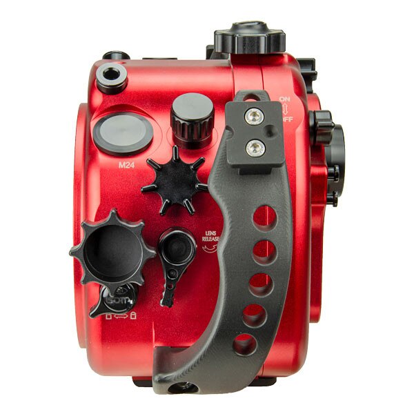 The focus in the study of the housing goes to the diver who decides to use it. The comfort in the use and management of the machine in water is a fixed point, studied in every detail. The handles are ergonomic, adjustable, and interchangeable. If necessary, the housing is compact and lightweight, so you won't tire your arm too much and have excellent control over stability. All buttons are conveniently reachable from the grip position of the handles ensuring maximum management of the camera with minimum effort. The rear back offers a full view of the camera screen so that you can shoot in live view unobstructed and comfort and it detaches completely from the front body so that it is easy to insert the camera and perform operations inside the housing. The presence of the viewfinder allows you to take pictures framing in a classic way and to replace it with a magnifier. The closing knob is Single-hand actionable.MORE AND MORE CUSTOMIZABLE!