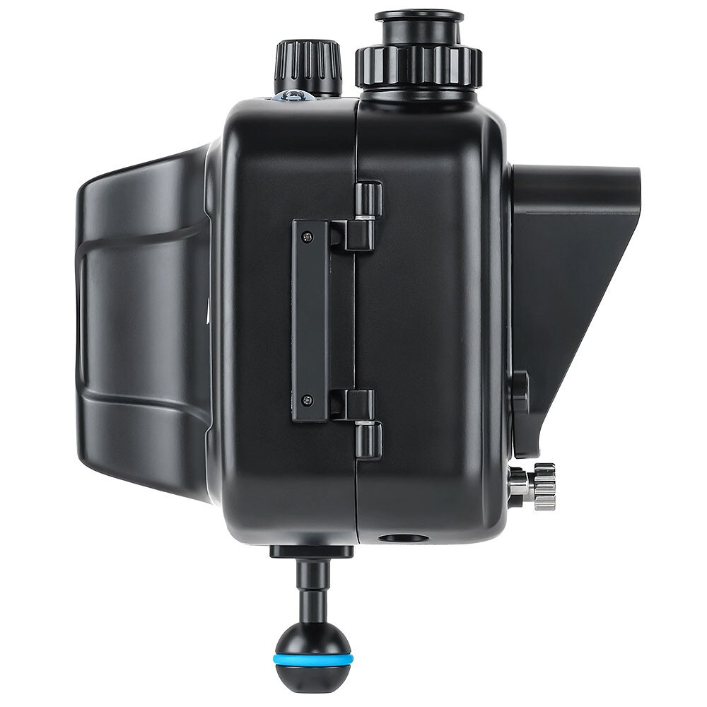 The NA-Ninja V-S supports up to the NP-F970 size battery which provides up to two hours of run time. A CR-2032 battery powers the vacuum check and leak detection system. When used with the included Vacuum Valve, the system gives real-time feedback about the watertight integrity of the housing through an easily visible multi-color LED on the top of the housing.