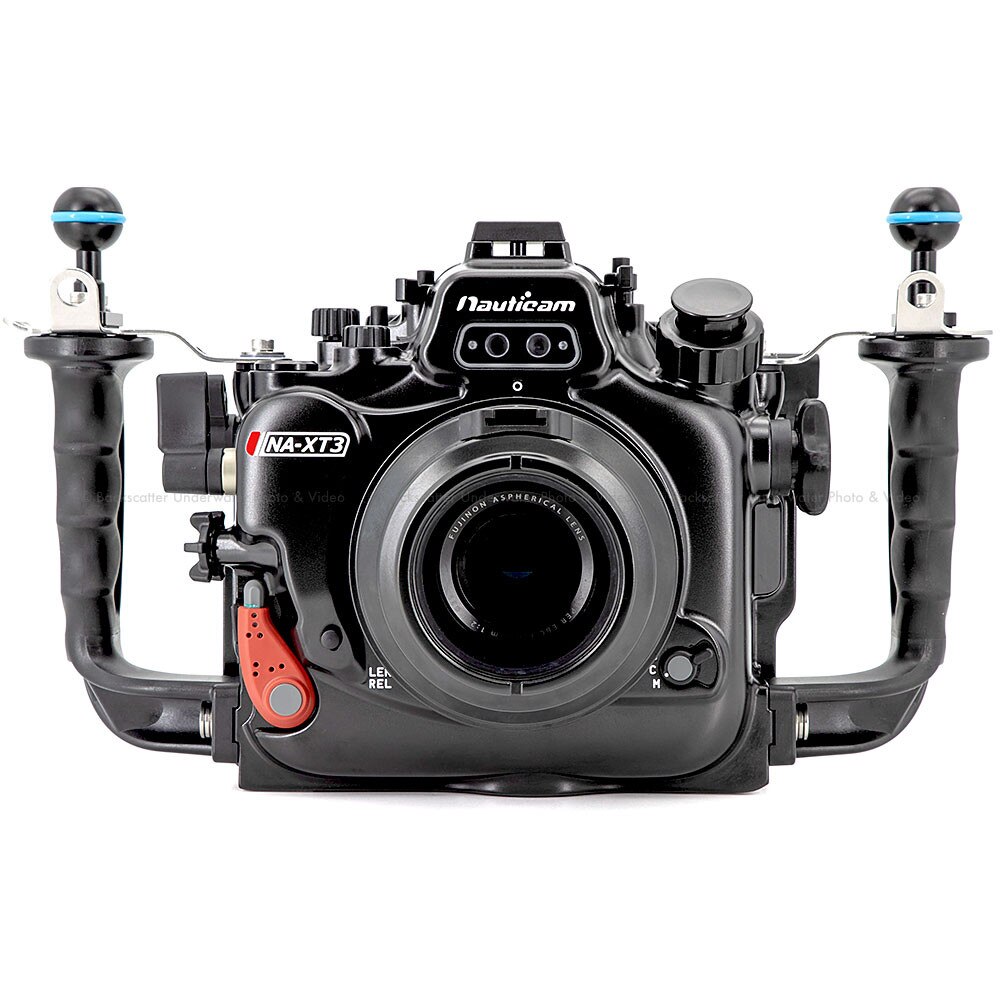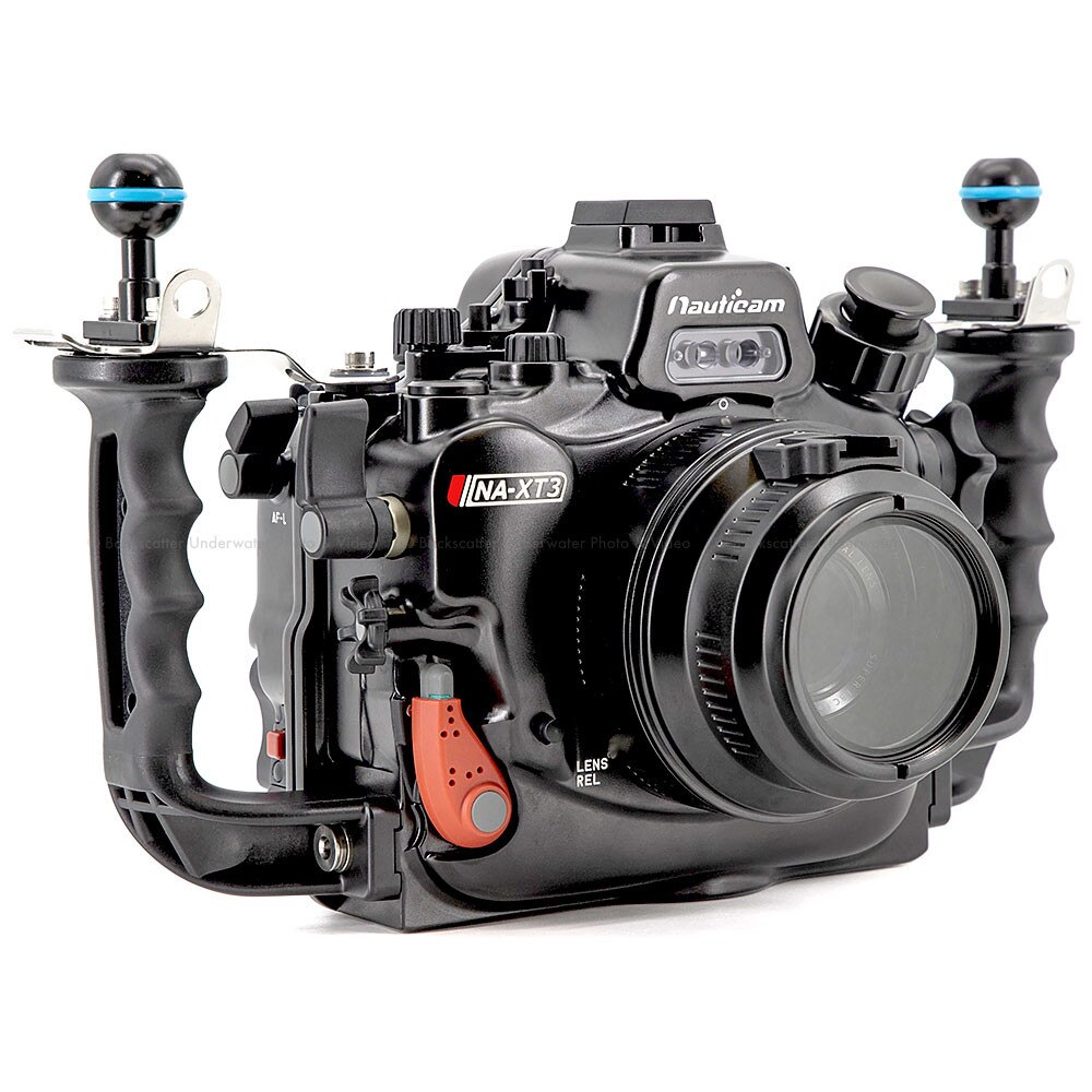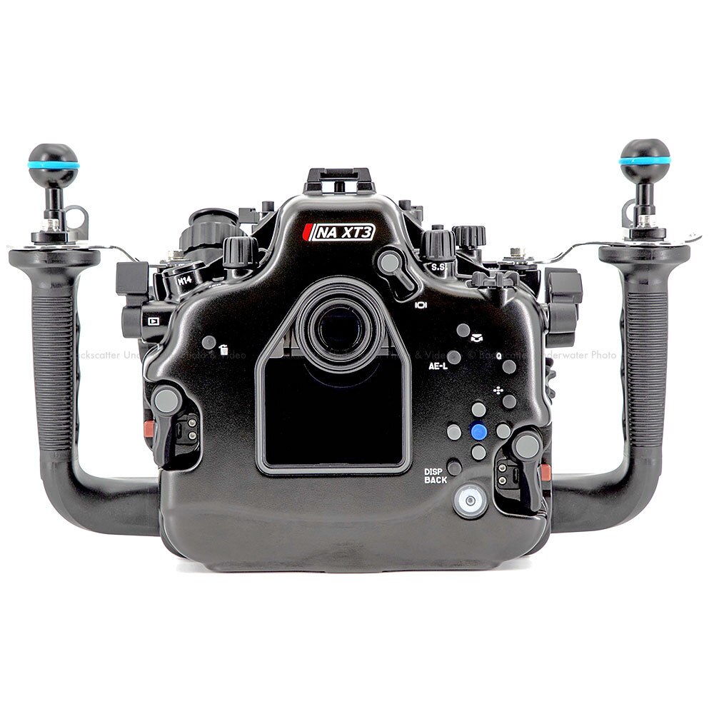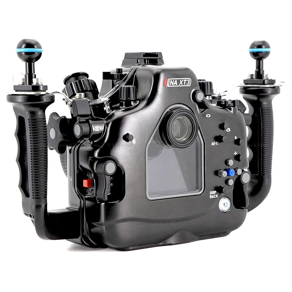 Nauticam has supported X-T1 and X-T2 cameras and continues to create innovative and ultra-functional housings for this line with the NA-XT3. More than just an updated badge, the NA-XT3 is a complete redesign of the series. With a form factor more closely resembling the NA-A9 for Sony's A9 mirrorless camera, the NA-XT3 features DSLR-style housing and port lock mechanisms as well as integrated ergonomic handles. An optional hand strap (PN 28130) can be added to the handles. The housing is designed with Nauticam's Mission Control concept of placing the most important camera controls as close to the handles as possible to facilitate effortless and quick camera operation to ensure you don't miss the shot.The NA-XT3 features thumb levers near both handles, with the left thumb lever actuating the playback function and the right thumb lever the AF-L control. The housing includes two M14 and one M24 bulkhead openings and an M5 threaded hole on top (underneath the cold shoe) for an additional ball mount.