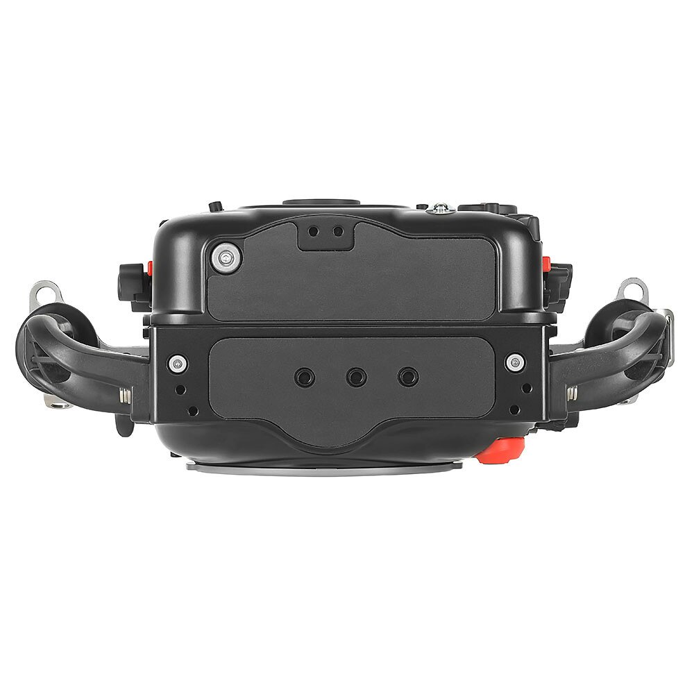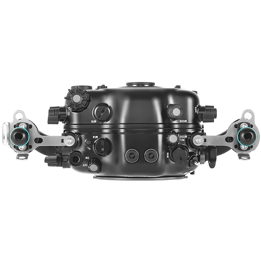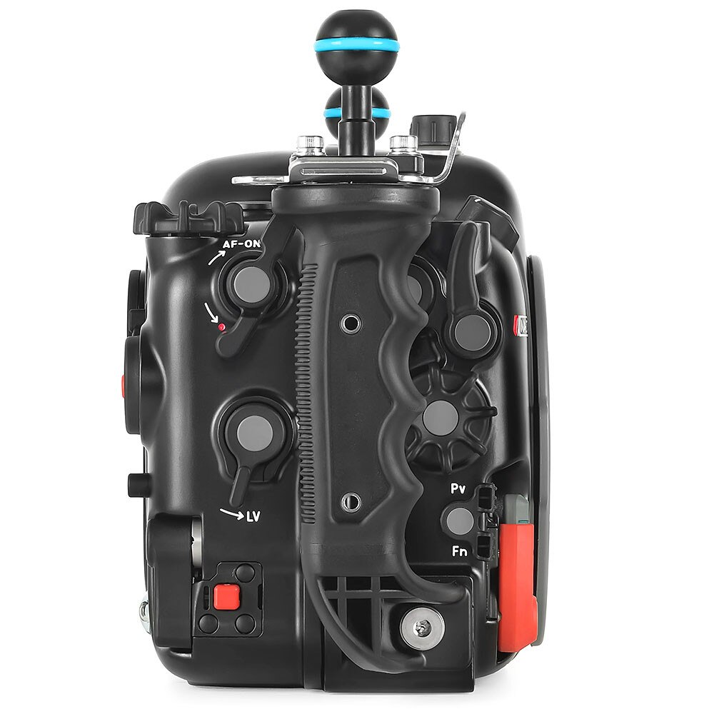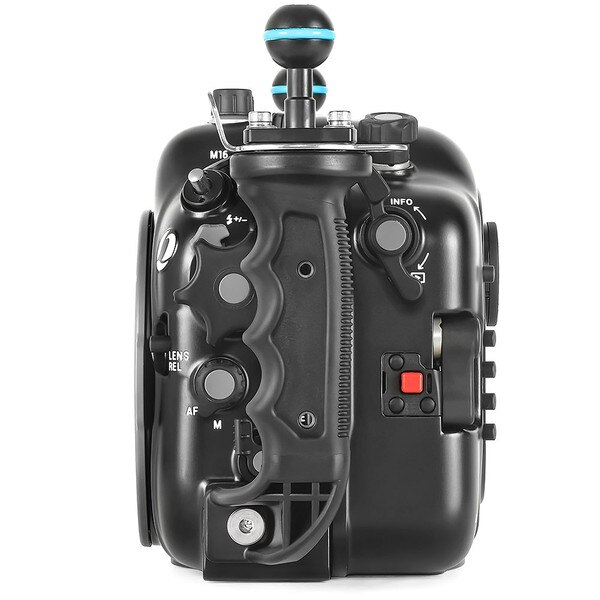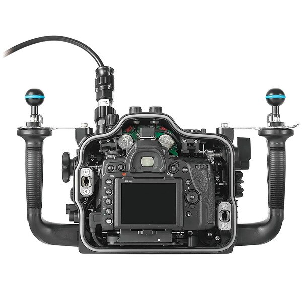 Front and rear control dials are readily accessible by the familiar large knurled dials at the right handle. The ergonomic housing handles are rubberized and feature stainless steel stiffening brackets to ensure a stable platform when using large strobes or video lights attached to the pre-installed 1" mounting balls.