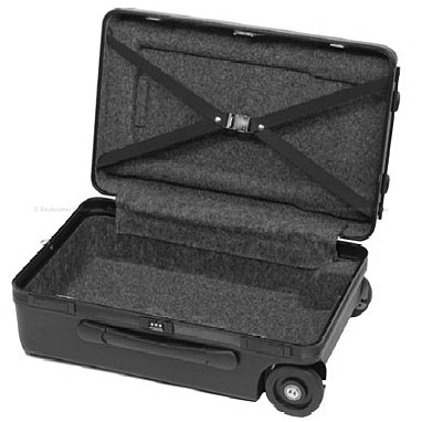 PC II Divider Camera Case with CART - is a hard side rolling airline carryon case. It is made with the professional photographer in mind. Inside the case main body it has a customizable panel divider system made of cloth coved foam with adjustable padded end tabs. The inside of the lid is protected with a removable convoluted gray foam insert that is held in place with an elastic cross over strap.