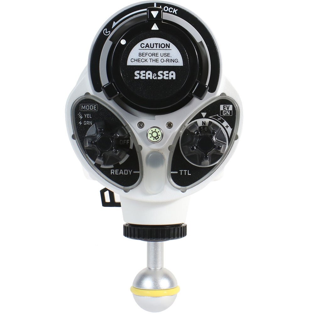 Backlight panel that is effective when shooting in dark environments. The indicator color on the back of the YS-D3 changes each time the position of the mode switch is changed. Blue (in DS-TTLII mode), Red (in RC mode), Yellow (in manual mode with pre-flash), and Green (in manual mode without pre-flash) The positioning of the operating system is obvious during night diving.Connection method with an arm that can be selected according to preference