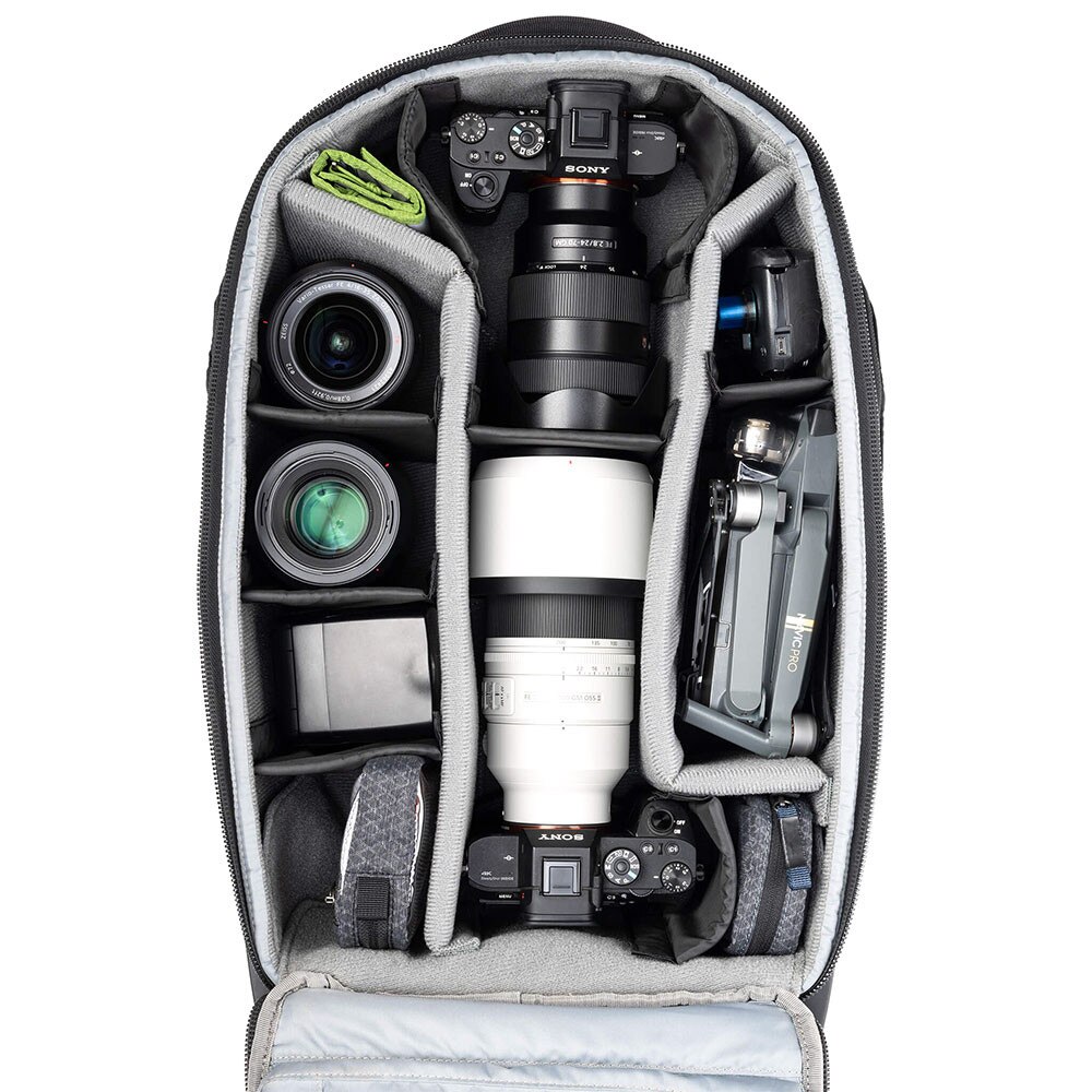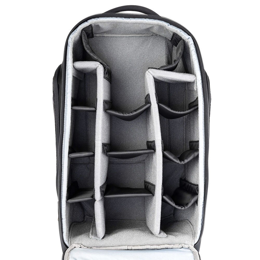 - Expansive top compartment cradles large camera bodies for the perfect fit
