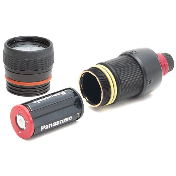 The light head and battery box are made from seawater-resistant aluminum alloy. Simple yet durable construction with double O-ring for moving parts supports depth rating 120m. The independent rotary switch part is equipped with a stopper to prevent accidental flooding due to over loosening.