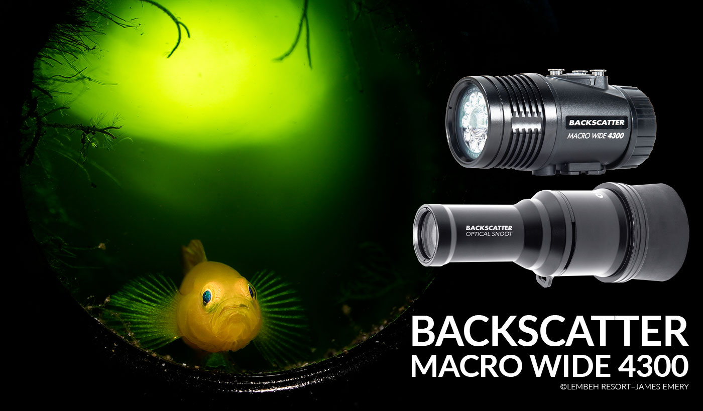 Backscatter Macro Wide 4300 LightRegular Price: $599.00 Sale Price: $499.00Save: $100.00Macro Wide 4300 Light & Snoot ComboRegular Price: $798.00 Sale Price: $649.00Save: $149.00Macro Wide 4300, Snoot, & Filter ComboRegular Price: $934.00 Sale Price: $738.00You Save: $196.00Macro Wide 4300 Dual Light PackageRegular Price: $1,356.90 Sale Price: $1,099.00Save: $263.90Macro Wide 4300 Remote Lighting PackageRegular Price: $991.95 Sale Price: $746.95Save: $245.00SEE ALL THE HOLIDAY DEALSThe Ultimate Dive, Photo, & Video Light: The Backscatter Macro Wide 4300Watch our video breakdown of everything you need to know about the Backscatter Macro Wide 4300 Video Light.The Ultimate Compact Video Light for Macro, Wide, and Snooting The Backscatter Macro Wide 4300 Video Light is the ultimate video light for any video or photo shooter. Its compact size is great for travel, it’s versatile for macro and wide shooters, and offers practical signaling options usable on any dive that goes way beyond a simple SOS pattern. The small size and simple control set of the Backscatter Macro Wide 4300 Video Light make it travel friendly and easy to use. Backscatter Macro Wide 4300 Underwater Video Light Regular Price: $599.00 Sale Price: $499.00 You Save: $100.00ORDER NOW The 4300-lumen wide beam is great for compact camera shooters looking for a small compact light that has a bright output for wide angle video. The 1400-lumen macro beam has been tailor-made for macro video shooters for all levels, from GoPro and compact all the way to full-frame SLR and cinema. Photographers looking for a focus light have plenty of power, plus a red mode for night time to avoid spooking critters and avoiding “the swarmies” from congregating all over your light and ruining the shot. Divemasters and guides will love the Alert and Beacon modes to get a diver's attention and to mark off locations on a night dive. Read on to learn all of the features and various uses for this highly versatile light. This macro demo reel was shot on location at Lembeh Resort by Backscatter Photo Pro James Emery with the Backscatter Macro Wide 4300, Backscatter Optical Snoot OS-1, Backscatter Color Filter System, and Sony a7S III Mirrorless Camera.4K underwater sample video footage captured with the Olympus TG-6 & Backscatter Macro Wide 4300 Video Light. Shot by Backscatter Photo Pro James Emery of Lembeh Resort.A 1400-Lumen Spot Beam Tailored Specifically for Macro Shooting The spot beam on the Backscatter Macro Wide 4300 Video Light was made specifically with macro shooters in mind. The tight, narrow beam with a hard edge has a beam pattern that will light up the subject without light spilling over into other unwanted areas of the shot. To get even tighter beam patterns, pair the Backscatter Macro Wide 4300 Video Light with the Backscatter Optical Snoot OS-1. Because macro mode is so bright, it has 5 power level settings to provide more granular control of the light output. For compact camera users, the light is bright enough to be used in place of a strobe for stills photography. For a pro-level macro shooter, this is all the light you’ll ever need for macro video. Even though this is a video light, it’s bright enough to knock out ambient light during the day time, even when shot with a snoot.A Video Light Built For Snooting Snooting has been very popular for photography in the past few years. It’s a great way to isolate a macro subject that usually blends into its environment and make it stand out and add more dramatic lighting. Snooting used to be limited to still photography. No more. The Backscatter Macro Wide 4300 Video Light has a spot beam designed specifically for the macro video shooter. This has been hard for video applications as most lights don’t have snooting capability, aren’t bright enough with a snoot, or if it is bright enough, are way too large to be practical for macro shooting. Backscatter Macro Wide 4300 Showcase by Fredi Schaschl The Backscatter Macro Wide 4300 Video Light was designed from the ground up to be used with the Backscatter Optical Snoot OS-1. The macro light pattern matches perfectly to the snoot to ensure the brightest beam possible for a snoot and video combination at a fraction of the size of larger lights. The Backscatter Macro Wide 4300 Video Light is the ultimate macro video light with a tight beam that can be made even tighter with the Backscatter Optical Snoot OS-1. With a narrow angle and a super-bright beam, the macro mode on the Backscatter Macro Wide 4300 Video Light is bright enough for small apertures and higher shutter speeds or shutter angles. With an EV value of 17 with the Optical Snoot OS-1 at its largest setting, the light is capable of an exposure of 1/125 ƒ32 at ISO 100. This is perfect for 4K 60p video shooting while maintaining a 180-degree shutter angle, and eliminating ambient light--even in the day time. 4300-Lumens of Power for Wide The 4300 lumen 85° degree wide beam pattern is designed specifically for wide angle video. The beam pattern has been tailored with a balance between beam angle and brightness. This makes it ideal for getting good light on foreground subjects while still making it easy to avoid introducing backscatter into the image. The wide mode has 3 power level settings. This wide angle demo reel was shot on location in the Maldives by Backscatter Video Pro Joel Penner with a pair of Backscatter Macro Wide 4300 Video Lights and the Canon EOS R5 Mirrorless Camera.The Backscatter Macro Wide 4300 Video Light pairs well with a GoPro or a compact camera for those shooters looking to keep travel size but still have a wide powerful beam for wide angle.Red Mode For Stealth on Night Dives Use the red mode for night diving as a focus light for macro, or for setting up a video scene. It's perfect for stealthily approaching skittish critters that don’t like a light at nighttime. The red mode has 3 power level settings. Calibrated Wide Angle Color Temperature The wide b
